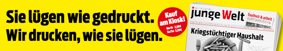 Die Tageszeitung junge Welt ist an tausenden Verkaufsstellen im Land erhältlich. Dort kann jeder zugreifen, sich mit unserer marxistisch-orientierten Blattlinie vertraut machen und sich von der Qualität unserer journalistischen Arbeit zu überzeugen.