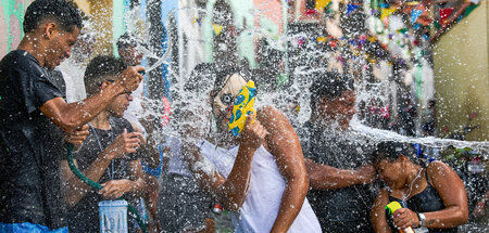 Vorsicht, Karneval! Im Rheinland gibt es bekanntlich Kamellen. Aber im fernen Venezuela ist es beliebt, sich wie auf dem Foto in der Metropole Caracas auch mit Wasser zu bespritzen oder Passanten mit Wasserbomben zu bewerfen.