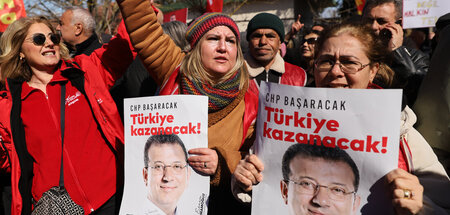 Vor dem Istanbuler Silivri-Gefängnis zeigen Menschen Unterstützung für den dort inhaftierten Bürgermeister und Erdoğangegner Ekrem İmamoğlu, gegen den am Montag der Hauptprozess begann.