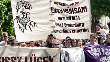 AboOranienburg. Rund 100 Menschen haben am Samstag mittag in der brandenburgischen Kleinstadt Oranienburg trotz strömenden Regens an Erich Mühsam erinnert.