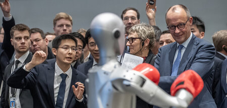 Während seiner ersten Reise als Bundeskanzler in die Volksrepublik werden Friedrich Merz vom Gründer der Firma Unitree Robotics, Wang Xingxing (l.), in Hangzhou boxende Roboter vorgeführt.