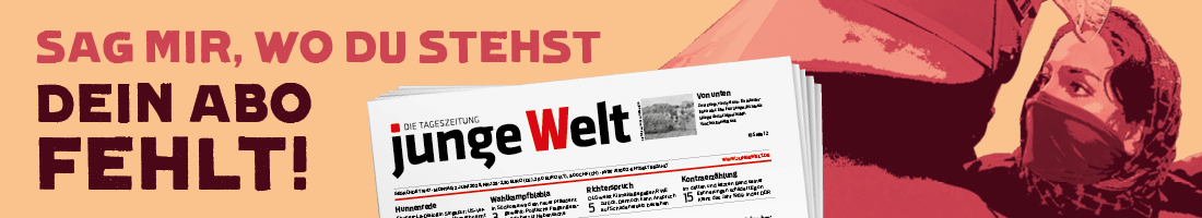 Als einzige marxistische Tageszeitung Deutschlands beschäftigt sich die junge Welt mit den großen und drängendsten Fragen unserer Zeit: Wieso wird wieder aufgerüstet? Wer führt Krieg gegen wen? Wessen Interessen vertritt der Staat? Und wem nützen die aktuellen Herrschaftsverhältnisse? Werden Sie jW-Abonnentin oder -Abonnent! So helfen Sie der Tageszeitung junge Welt nicht nur am effektivsten – Sie profitieren auch am meisten von den vielfältigen Vorteilen.