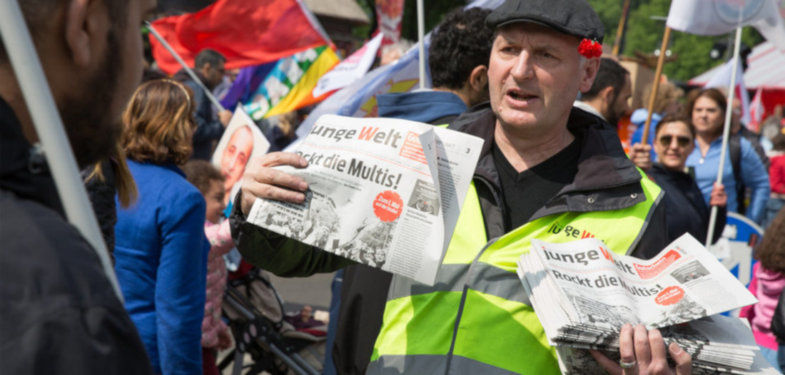 Die junge Welt bei Klima- und Gewerkschaftsprotesten verteilen
