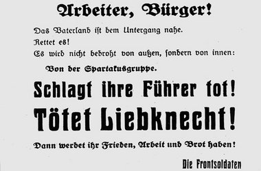 Unstrittig bisher immerhin, daß die Ermordung von Liebknecht und Luxemburg (und vieler anderer Spartakisten) Verbrechen waren. Zugegeben wird auch, daß ihre Mörder wie auch deren sozialdemokratischen Hintermänner bekannt sind, aber straffrei blieben. Zuletzt hat das Klaus Gietinger in seinem im Januar veröffentlichten Buch »Der Konterrevolutionär«, einer Biografie über Waldemar Pabst, nachgewiesen. Aus aktuellem Anlaß hat deshalb die Journalistin Liane von Billerbeck für Deutschlandradio mit dem Autor ein Interview geführt. Es sollte genau zum 90. Jahrestag der Ermordung der Revolutionäre am 15.Januar gesendet werden. Zu hören war dann aber nicht Gietinger, sondern der Historiker Hans-Ulrich Wehler. Der sei so interessant gewesen, während man Gietingers Interview nicht hätte senden können, wurde mitgeteilt. Auszüge aus dem Gespräch belegen zumindest ersteres: Wehler: »Ich gehöre nicht zu denen, die diesen Mythos um Liebknecht und Luxemburg teilen...Wer den Bürgerkrieg entfesselt, lebt immer im Angesicht des Todes; wenn er von der Gegenseite erwischt wird, wird er an die Wand gestellt. Wenn Rosa Luxemburg und Karl Liebknecht korrekt überstellt worden wären, wären sie abends vor ein Standgericht gekommen und erschossen worden. So sind sie greulich erschlagen worden...« Billerbeck: »Aber nun waren doch ihre eigenen Genossen an der Macht.« Wehler: »Ja, was heißt eigene Genossen. Sie waren früher einmal SPD-Mitglieder gewesen und waren ... ausgeschert ... Das ist ja oft so, daß ... feindliche Brüder sich ungleich gehässiger gegenüberstehen als andere ... Die SPD ... mußte alles daran setzen, daß das Land nicht im Bürgerkrieg versank. Also da sehe ich ... überhaupt nicht, wie man heute noch daran zweifeln kann, daß die SPD im Besitz ... der frisch geborenen Macht in der Republik anders handeln konnte, als gegen diese Bürgerkriegspartei vorzugehen.« Billerbeck: »War die SPD-Führung viel enger mit der Reichswehr und der Obersten Heeresleitung verbunden, als bisher angenommen?« Wehler: »...Die SPD hat sich weithin vorbehaltlos drei Jahre mit der Reichsführung und der Kriegsführung identifiziert. Dann schert sozusagen ein linker Flügel aus... Wenn man jetzt die Konstellation sich vergegenwärtigt, ein Heer, rund acht Millionen Männer noch unter Waffen zurückzuführen, die Gefahr, daß die Revolution... das Land weiter in Unruhe versetzt oder wirklich wie im Januar 1919 in Berlin in den Bürgerkrieg stürzen würde, das ist für diejenigen, die nun ganz unerwartet – wie die Gruppe Ebert – die Macht übernehmen, eine ... Bedrohungssituation. Und jeder hatte vor Augen, was in Rußland passiert war, als es dem Premier Kerenski nicht gelungen war, das Land zu stabilisieren und Lenin dann übernommen hatte. Das ist die tiefe Furcht.« Billerbeck: »Das heißt, man wollte den Kommunismus verhindern und hat dafür billigend den Tod von Liebknecht und Luxemburg in Kauf genommen.« Wehler: »So würde ich in einer Diskussion, wenn ich ein Seminar in Gang kriegen müßte, auch mal formulieren. Wenn man in einer solchen Situation handeln muß... dann muß einer, wie Noske immer von sich gesagt hat, da den...« Billerbeck: »Einer muß der Bluthund sein.« Wehler: »Der Bluthund, ja. Einer muß den Bluthund spielen.«