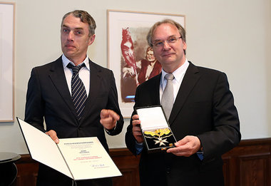 junge Welt-Leser Neo Rauch (l.) erhielt am 1. Juni 2012 im Rathaus in Aschersleben den Verdienstorden des Landes Sachsen-Anhalt von Ministerpräsident Reiner Haseloff (CDU)