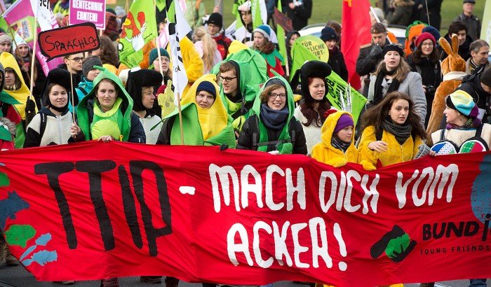 Berlin. Bis zu 50.000 Menschen, darunter Bauern und Imker sowie Verbraucher, haben am Samstag am Rande der »Grünen Woche« in Berlin gegen Massentierhaltung, Gentechnik und das Freihandelsabkommen TTIP demonstriert. Die Polizei sprach zunächst von weniger Teilnehmern als die Veranstalter der »Kampagne Meine Landwirtschaft«. Mehr als 90 Traktoren rollten mit der Menge vom Potsdamer Platz in Berlin-Mitte zum Bundeskanzleramt. Mit Luftballons, Trillerpfeifen und Tierkostümen forderten die Demonstranten fairen Handel, artgerechte Haltung von Nutztieren, faire Preise für die Güter von Landwirten und eine gentechnikfreie Saatgutvielfalt. Zu dem Protestzug hatte ein Zusammenschluss von mehr als 80 Bauern-, Verbraucher-, sowie Tier- und Umweltschutzorganisationen aufgerufen. Das TTIP-Abkommen diene »einseitig global agierenden Konzernen und wird vielen bäuerlichen Betrieben hier und weltweit die Existenzgrundlage entziehen«, sagte Jochen Fritz, Sprecher des »Wir haben es satt!«-Bündnisses. »Gleichzeitig drohen die Verbraucherstandards gesenkt zu werden. Das heißt mehr Gentechnik im Trog und Hormonfleisch durch die Hintertür«, warnte er. Das Bündnis fordere deshalb Bundeskanzlerin Angela Merkel (CDU) und Bundeswirtschaftsminister Sigmar Gabriel (SPD) auf, TTIP zu stoppen.