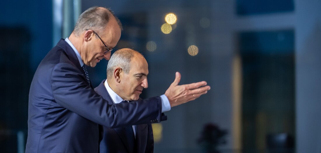 Dieses sende »ein wichtiges positives Signal weit über die eigentliche Region hinaus«. Armenien wisse, dass »viele Voraussetzungen« für eine EU-Mitgliedschaft erfüllt werden müssten. Merz verwies auf die Kopenhagener Kriterien zu Rechtsstaatlichkeit, Menschenrechten und Marktwirtschaft. Mit Blick auf die im kommenden Jahr anstehende Parlamentswahl in Armenien sagte der Bundeskanzler, es sei »verstörende Normalität geworden, dass Wahlen von den Feinden der Demokratie angegriffen werden«. In Armenien versuche »insbesondere Russland«, Angst vor einer »zu großen Annäherung an westliche Partner zu machen«. Merz war zuletzt mit anderen Staatschef mehrerer EU-Länder nach Moldau gereist, um kurz vor den dortigen Wahlen aktiv Werbung für den prowestlichen Kandidaten zu machen.