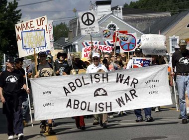 Kennebunkport. Die Antikriegsbewegung der USA läßt George W. Bush nicht in Ruhe. Am Samstag rückten dem Präsidenten über 1000 Kriegsgegner, darunter auch Veteranen aus den Kriegen gegen Irak und Afghanistan (Foto), in Kennebunkport/Maine auf die Pelle. In dem knapp 4000 Einwohner zählenden Ort am Atlantik, der über ein Einkaufszentrum, neun Kirchen sowie den Sommersitz von Bush senior verfügt, verbrachte Bush junior ein verlängertes Wochenende.