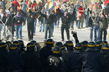 »Wir sind friedlich – was seid ihr?«, skandieren die Demonstranten in Strasbourg. Damit zielen sie nicht auf den schwarzen Block, sondern das brutale Agieren der Polizei. Die Hinweise darauf verdichten sich, daß Ausschreitungen polizeitaktisch provoziert und in Kauf genommen wurden, um einen Vorwand zur Sperrung der Brücke zu erzeugen.