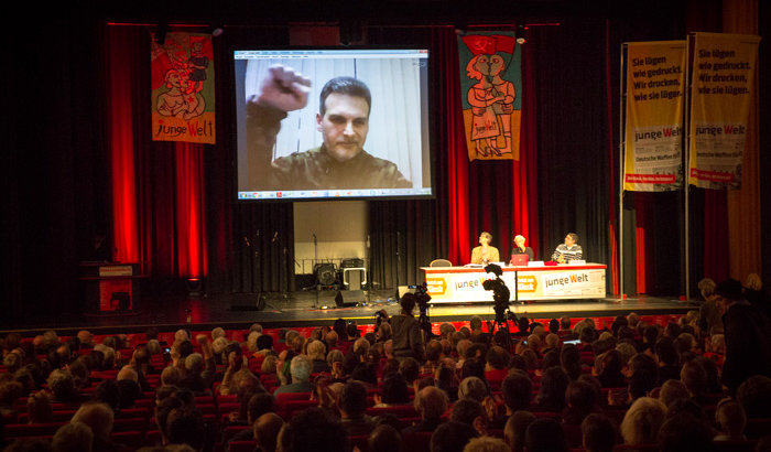 Alexej Markov, Gründer und Kommandeur der politischen Abteilung der kommunistischen Brigade »Prisrak« im Donbass gab im live geführten Video-Interview Einblicke in den Alltag der Kämpfer, die in westlichen Medien meist als »prorussische Separatisten in der Ostukraine« bezeichnet werden. An seinem Frontabschnitt in der nicht anerkannten Volksrepublik Lugansk gibt es demnach Freiwillige aus zahlreichen anderen Ländern: »Unsere Genossen aus Italien und Spanien, die leiden natürlich an diesen heftigen Wintern, die sind es nicht gewohnt. Aber umso leichter haben es unsere finnischen Genossen«, sagte er im Gespräch mit Susann Witt-Stahl. Die Chefredakteurin der linken Musik- und Kulturzeitschrift war mehrfach in die Region gereist, saß heute aber auf dem Podium der Rosa-Luxemburg-Konferenz in Berlin. Sie fragte Markov auch nach direkten Auseinandersetzungen mit den rechten Freiwilligenbataillonen, die er im Gegensatz zur regulären ukrainischen Armee als »echte Nazis« bezeichnet. Laut Markov war seine Brigade schon mehrfach in Kämpfe mit ihnen verwickelt – sie hätten auch besonders häufig die Waffenruhe gebrochen. »Die regulären ukrainischen Truppen führen sich weitaus milder auf.« Auch sie würden übrigens von den faschistischen Bataillonen beschossen, die offiziell auf ihrer Seite kämpfen.