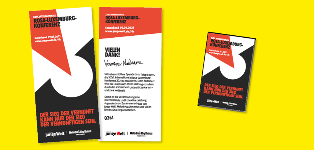 Wie bereits an dieser Stelle bekanntgegeben wurde, kann angesichts der Coronapandemie die 26. Ausgabe der Internationalen Rosa-Luxemburg-Konferenz am 9. Januar nicht wie gewohnt in einem großen Saal mit Publikum über die Bühne gehen. Statt dessen werden wir sie als reine Onlineveranstaltung stattfinden lassen. Sie wird auf www.jungewelt.de live gestreamt, ohne Zugangsbeschränkungen. Zwar sparen wir damit die Miete für den Veranstaltungsort, jedoch stehen dem hohe Kosten für Technik und Werbung gegenüber. Derzeit rechnen wir mit einer Summe von bis zu 50.000 Euro.
